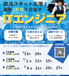 4月の会社説明会が決定しました! IT業界やソフトウェア開発に興味を持つ方なら大歓迎!学生時代のプログラミングスキルは問いません。社員の約半数は文系大学出身です。 未経験からITエンジニアを目指せる研修制度・働く環境・仕 […]